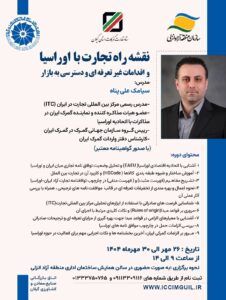 اتاق بازرگانی، صنایع، معادن و کشاورزی گیلان دوره آموزشی “نقشه راه تجارت با اوراسیا و اقدامات غیرتعرفهای و دسترسی به بازار” برگزار می کند تا زمینه ی آشنایی هرچه بیشتر تجار، فعالان و علاقه مندان حوزه ی اوراسیا با نقشه ی تجارت این منطقه ی مهم و استراتژیک فراهم آید.