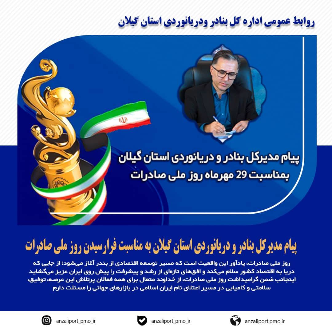 مدیرکل بنادر و دریانوردی گیلان و مدیر منطقه ویژه اقتصادی بندر آستارا با صدور پیامی فرارسیدن روز ملی صادرات را تبریک گفت.